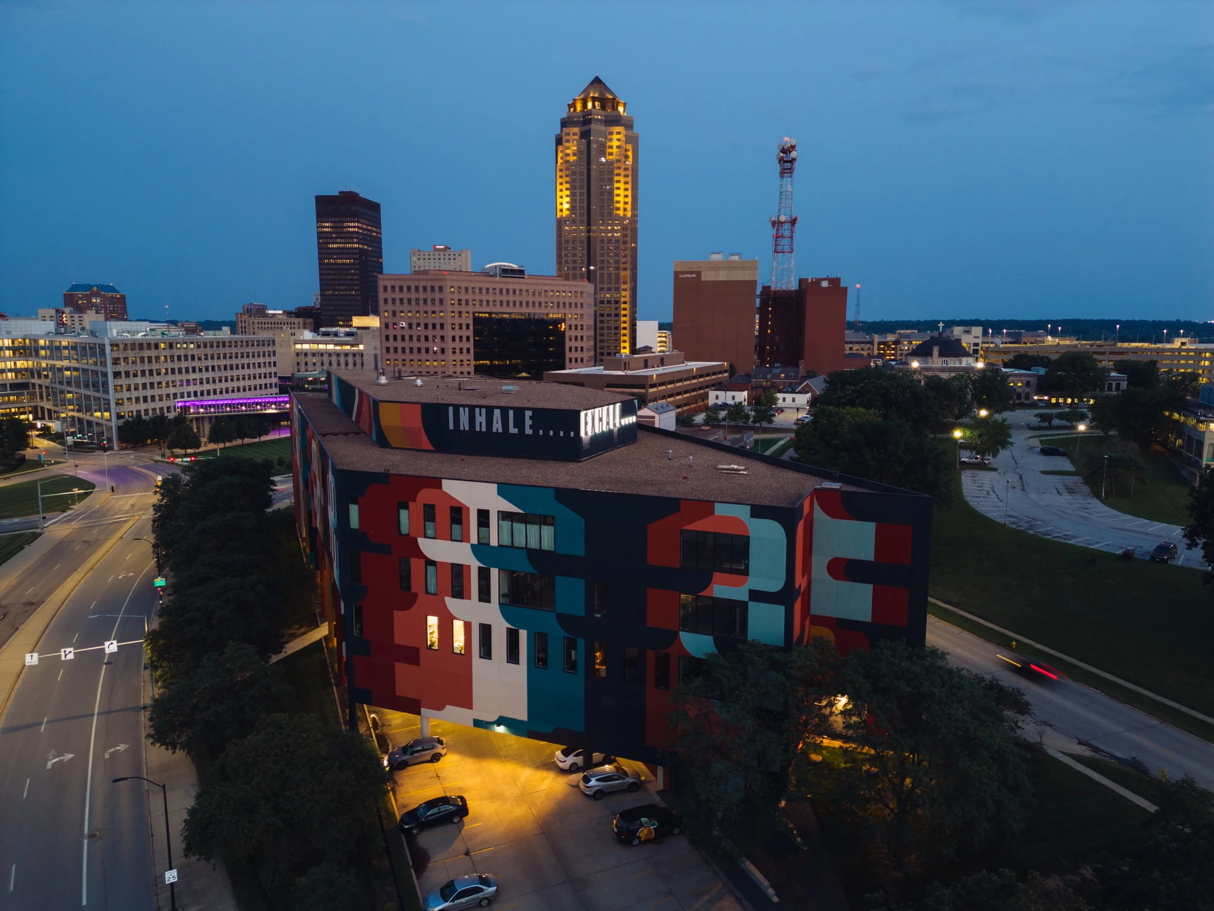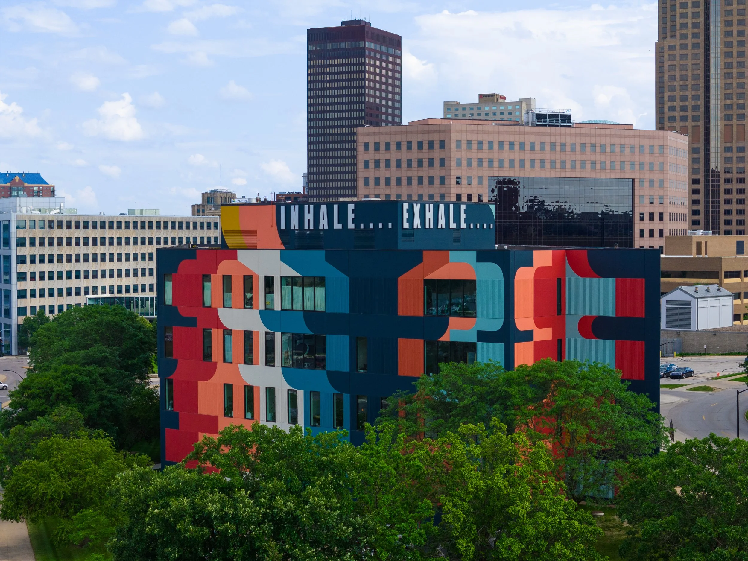 A rooftop installation titled Inhale, Exhale by Des Moines artist and activist Jordan Weber was installed at Mainframe Studios, featuring mirrored, LED-lit letters visible from I-235 and oriented toward the Oakridge Neighborhood. Designed as a meditative and healing message in the face of adversity, the piece reflects Weber’s ongoing work addressing racism and environmental justice through public art and urban intervention.