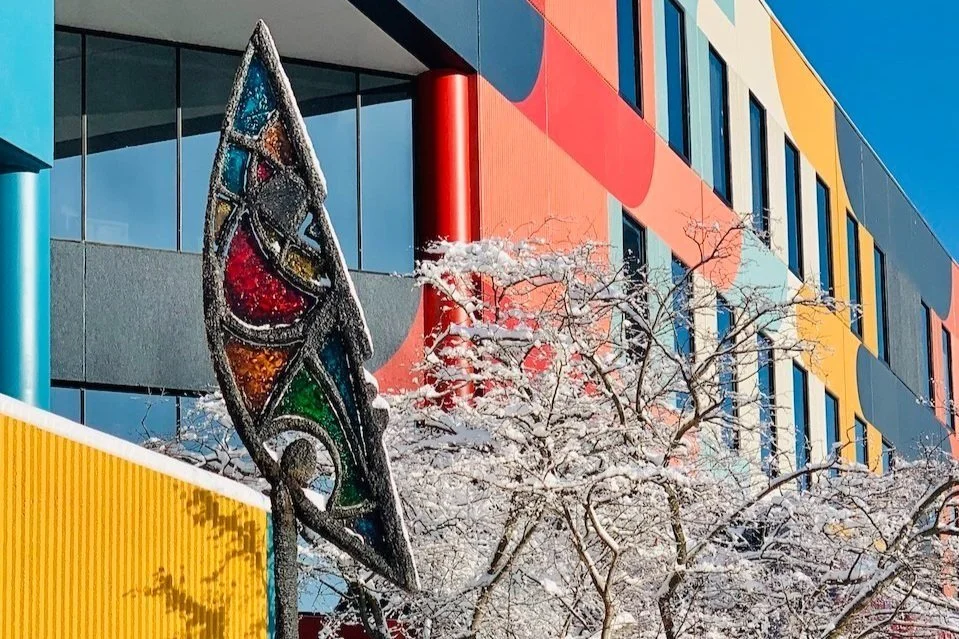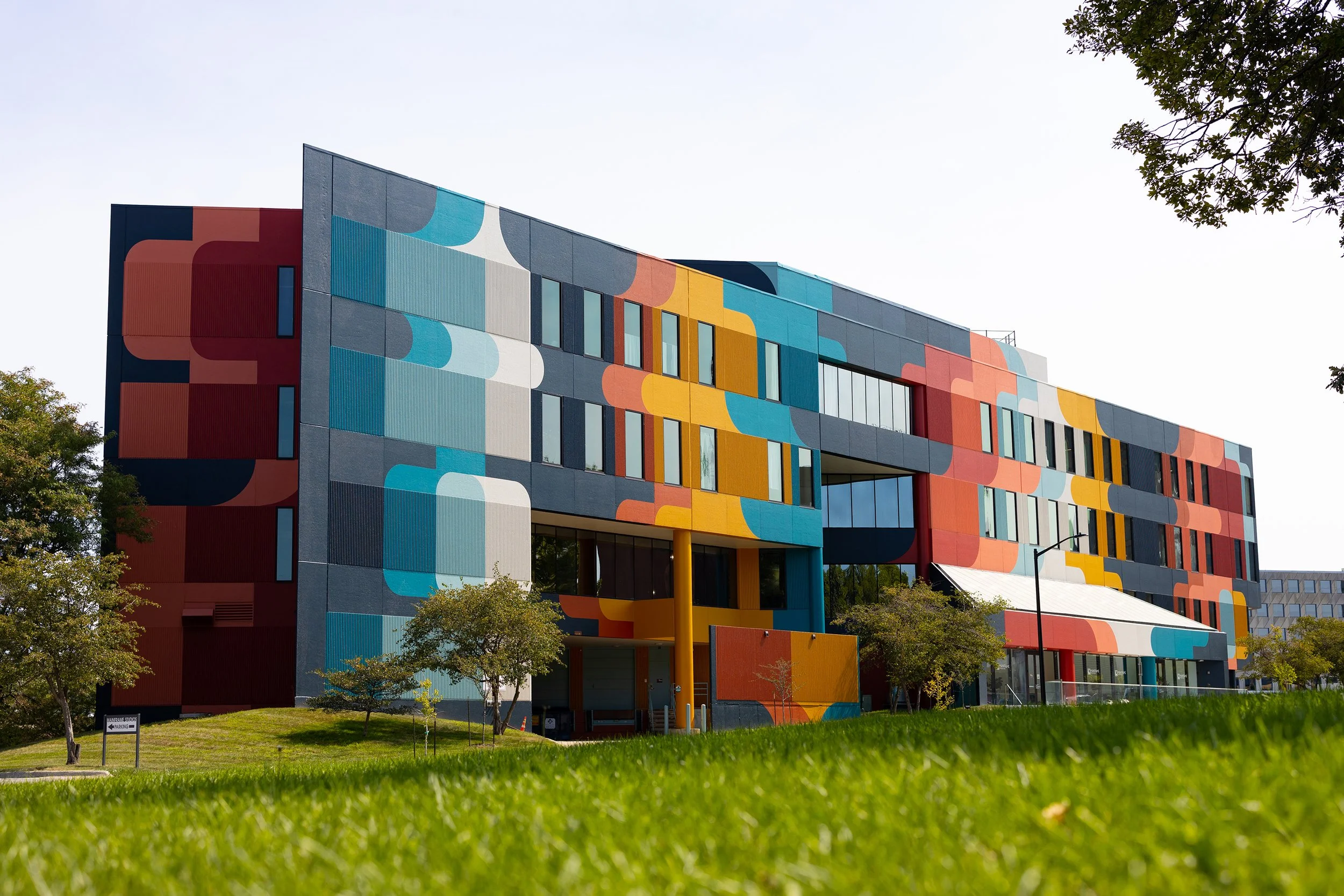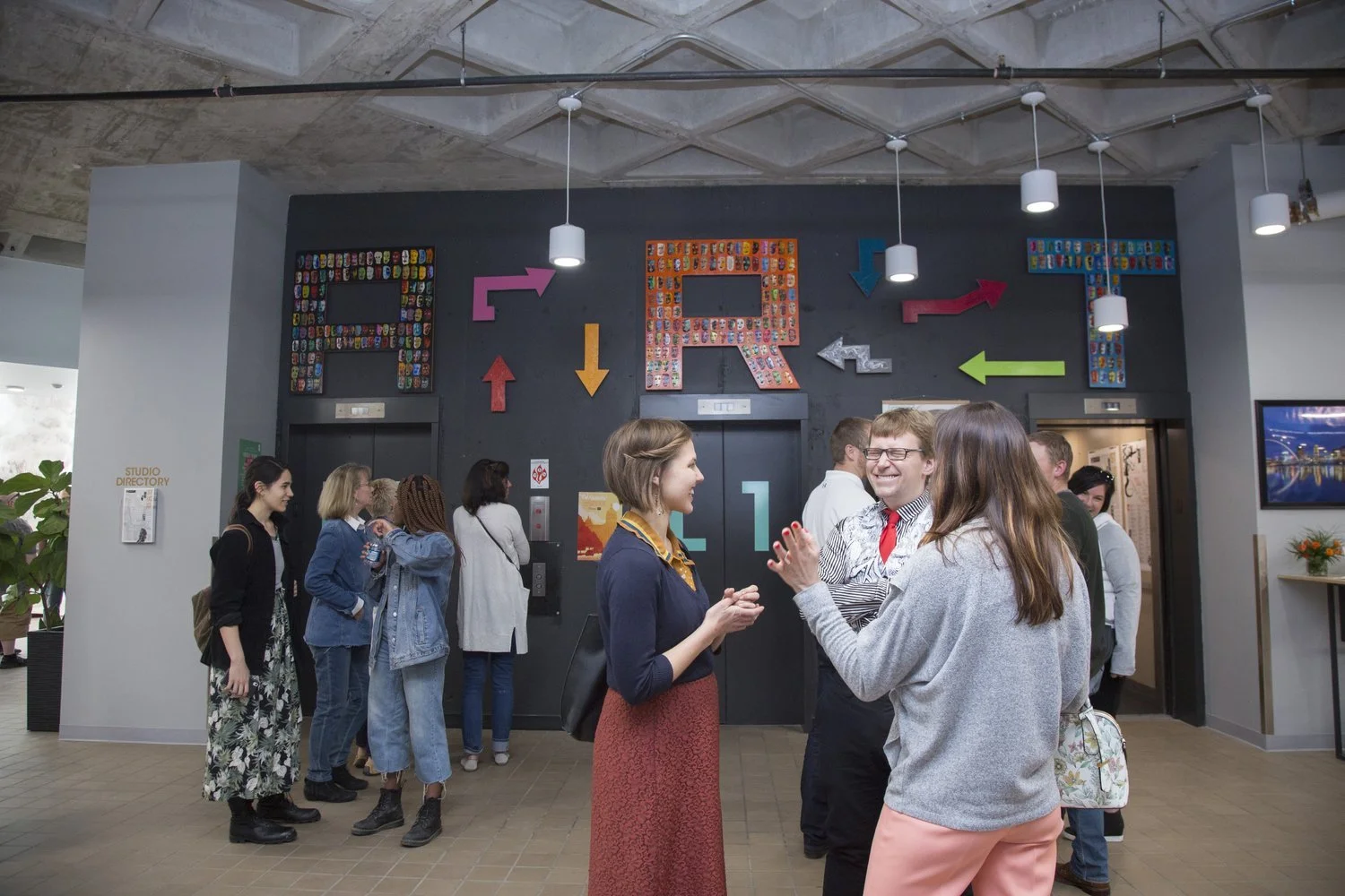 A striking art installation by renowned Graphic Designer Jay Vigon is featured above the elevators on the first floor of Mainframe Studios. Showcasing his iconic painted faces, the piece honors the building's diverse community and adds a vibrant, energetic touch to the lobby.