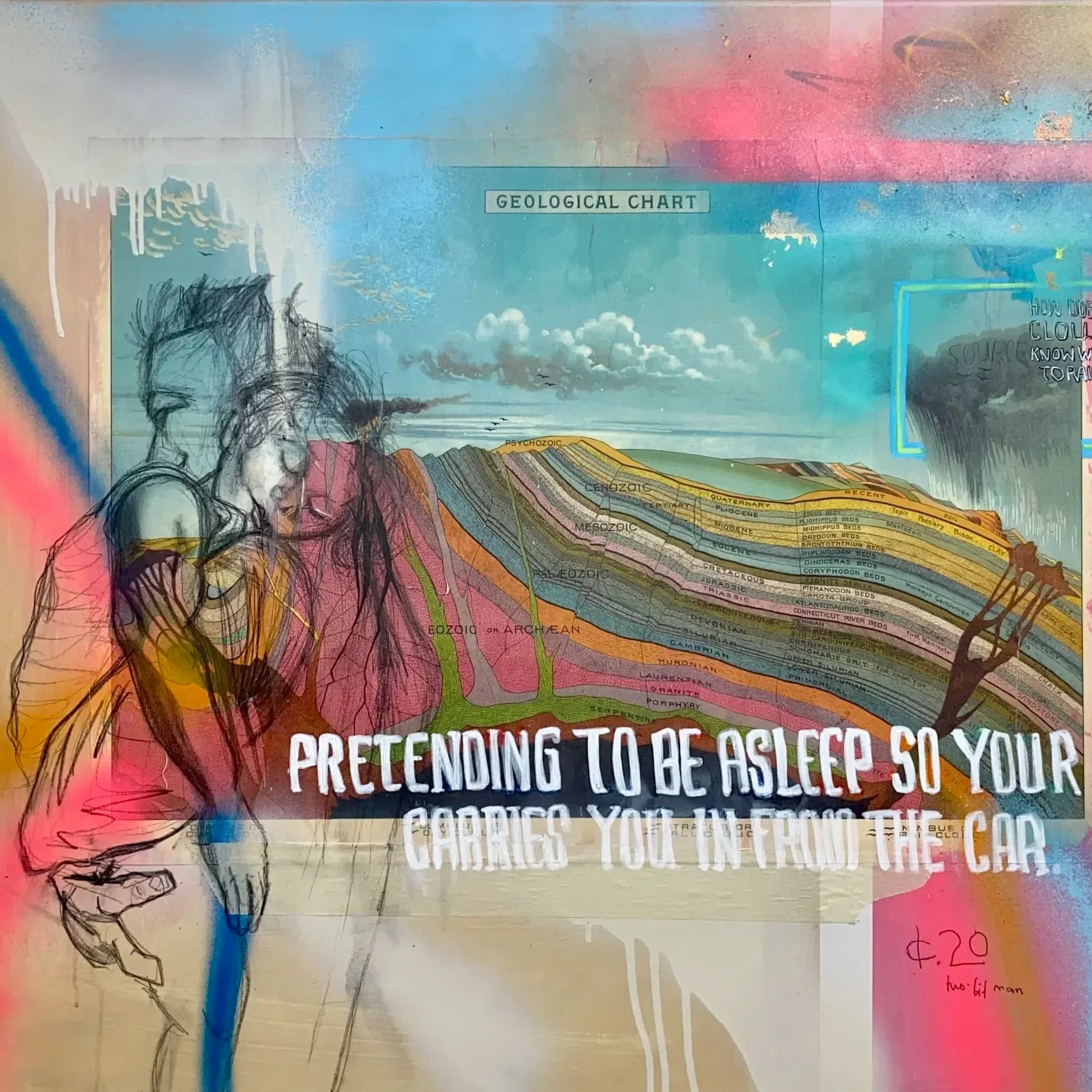 "Playin' Possum" captures a tender, universal memory- the quiet ritual of pretending to sleep so you could be carried home. The soft, overlapping figures evoke the blue of that moment, whole the geological chart becomes a metaphor for the emotional layers and foundations such small acts of care create." - Artwork Statement by Geoff Paulline